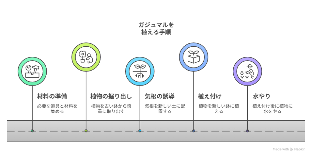 手順は、通常の植え替え作業に「気根の誘導」を加えるイメージです。
