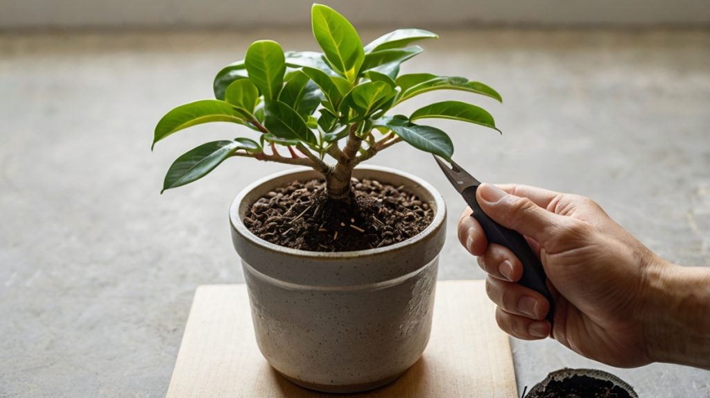 ガジュマルの挿し木を、ひょろひょろではなく、がっしりとした力強い姿に育てるためには、適切な「剪定(せんてい)」と「日照管理」が欠かせません。これらは、いわばガジュマルの健康診断と、理想の体型を作るためのトレーニングのようなもの。まず剪定ですが、これは単に形を整えるだけでなく、植物のエネルギーを新芽や枝に効率よく集中させ、より密で丈夫な成長を促す効果があります。挿し木がある程度成長し、新しい葉が数枚しっかりと開いたら、思い切って一番上の芽(頂芽)を指で摘んでみましょう(摘心といいます)。こうすることで、脇から新しい芽が伸びやすくなり、横にこんもりと広がる樹形を作ることができます。