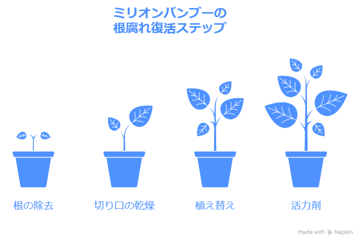 ミリオンバンブーが根腐れを起こすと、水分や養分をうまく吸収できなくなり、株全体が弱ってしまいます。茎が根元からぶよぶよする、土や水から異臭(腐敗臭)がする、葉が急に黄色くなったり萎れたりする場合は、根腐れの可能性が高いです。しかし、諦めないでください!早期発見と適切な処置で、復活させられる可能性があります。
