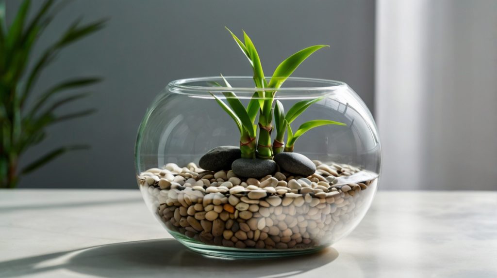 - ハイドロボールやセラミスなどの人工培土を容器の1/5程度入れ、ミリオンバンブーを配置します。根が広がるスペースを考慮しましょう。