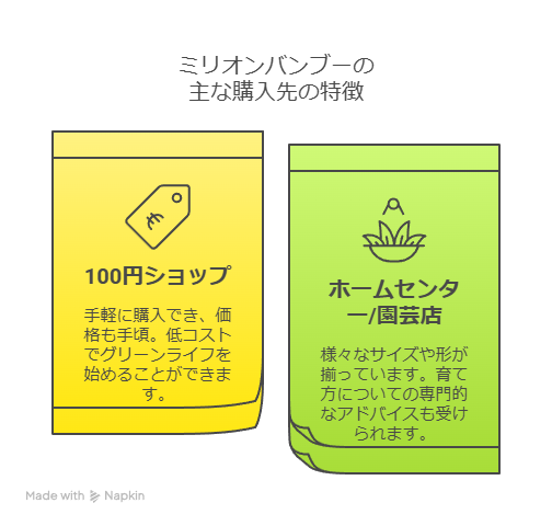 もちろん、ホームセンターや園芸専門店でも購入可能です。こちらでは、様々なサイズや形のミリオンバンブーが揃っていますし、育て方について専門的なアドバイスをもらえることもあります。品揃えの豊富さや、より状態の良いものを選びたい場合は、ホームセンターや園芸店も覗いてみると良いでしょう。